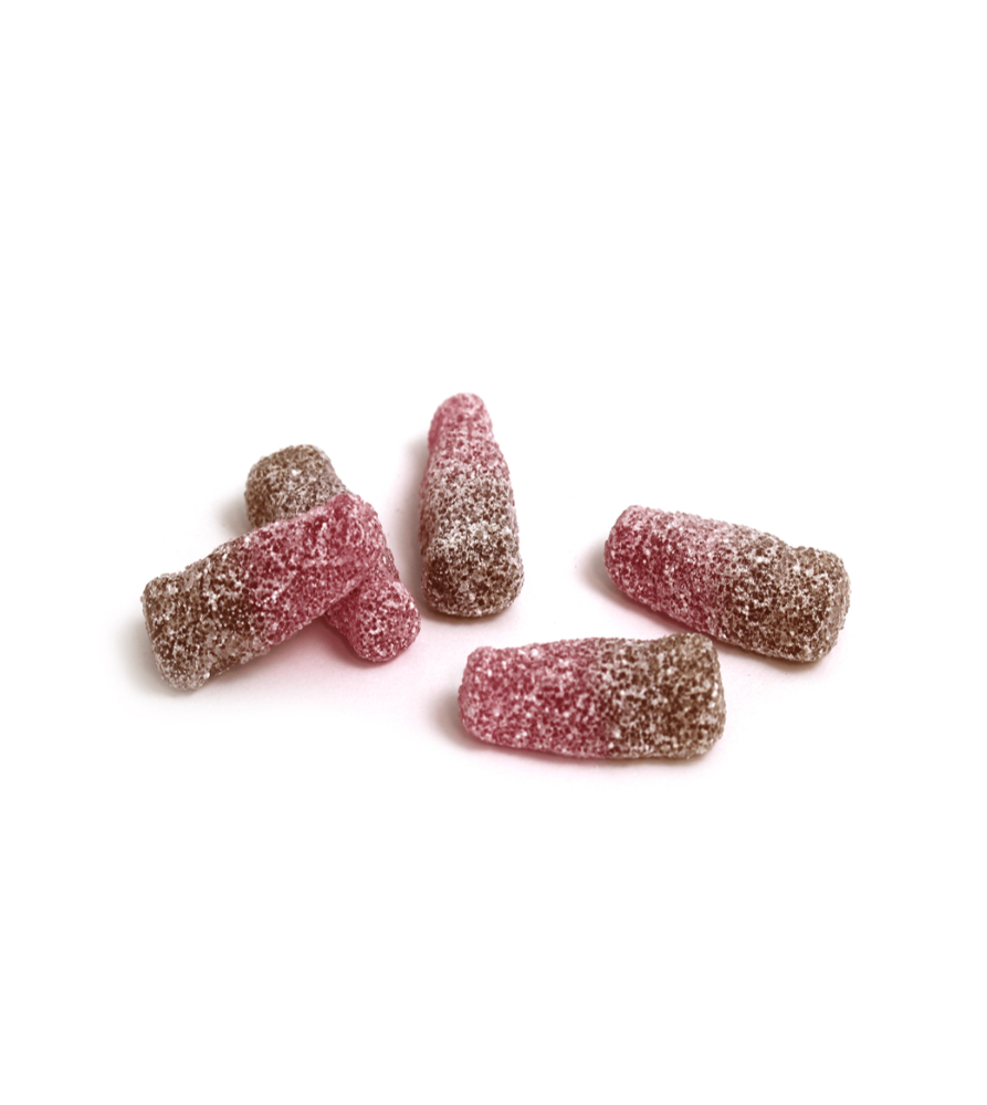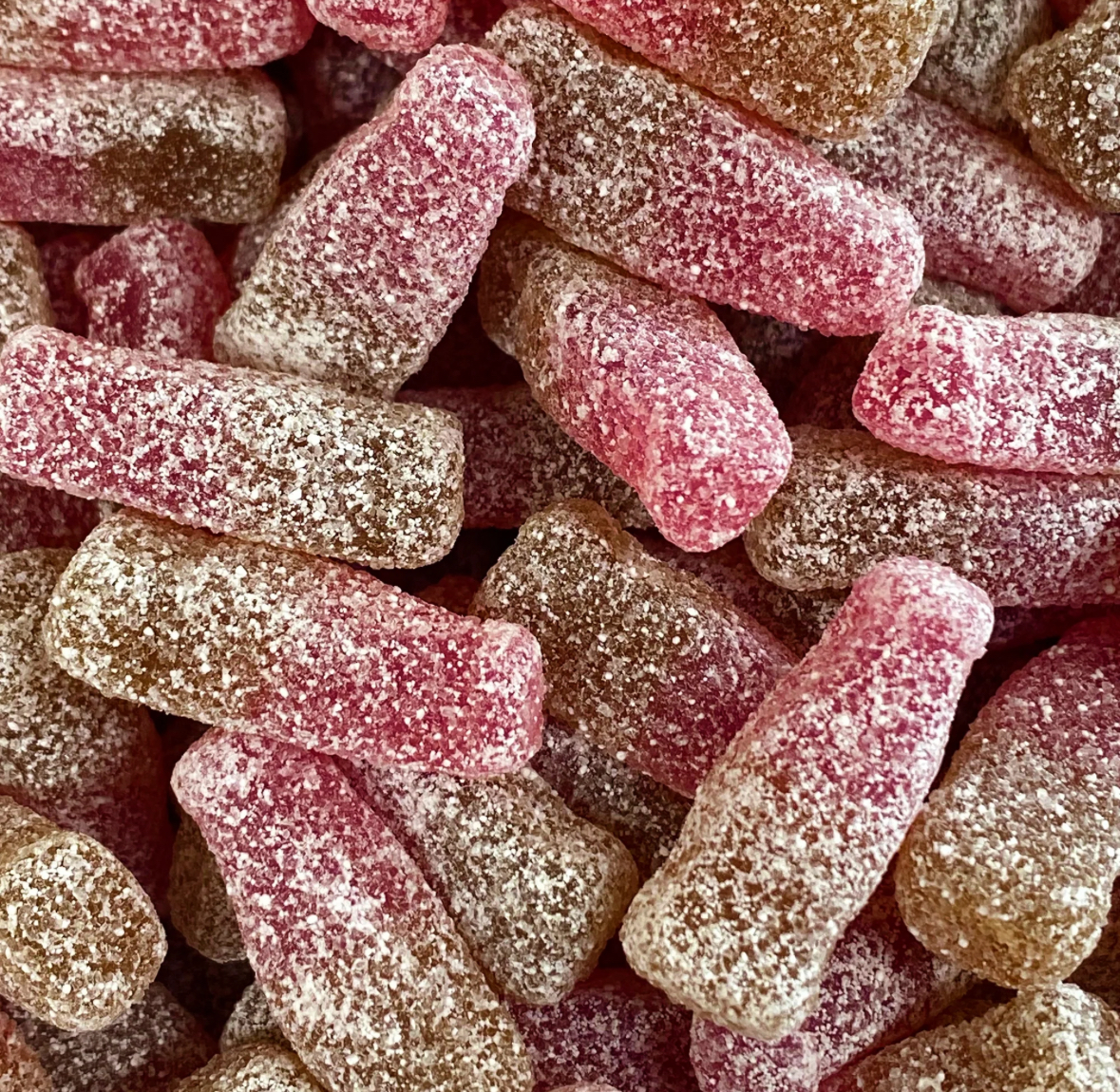 The long established fizzy cola bottles now come in cherry flavour. Fizzy cherry cola bottles are bottle shape jellies with a distinct cherry cola flavour coated in a fizzy sugar. Delicious Sweets suitable for vegans and are dairy free and gelatine free.
