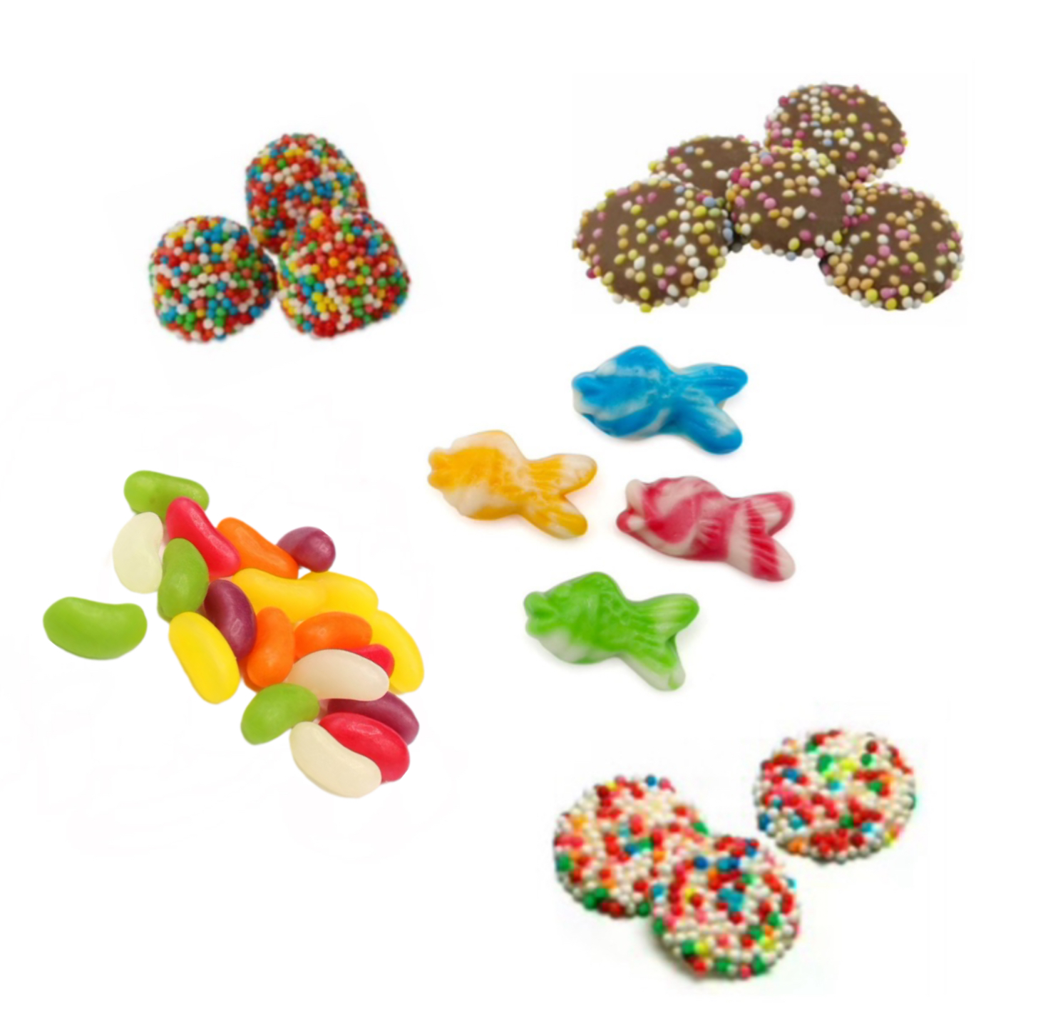 Everyone loves a rainbow and here is the perfect colourful mix.Its sure to brighten everyone’s day, sweets include chocolate jazzies, snowies, jelly beans, swirly fish. Favourite sweets in your keep fresh and resealable pouch.